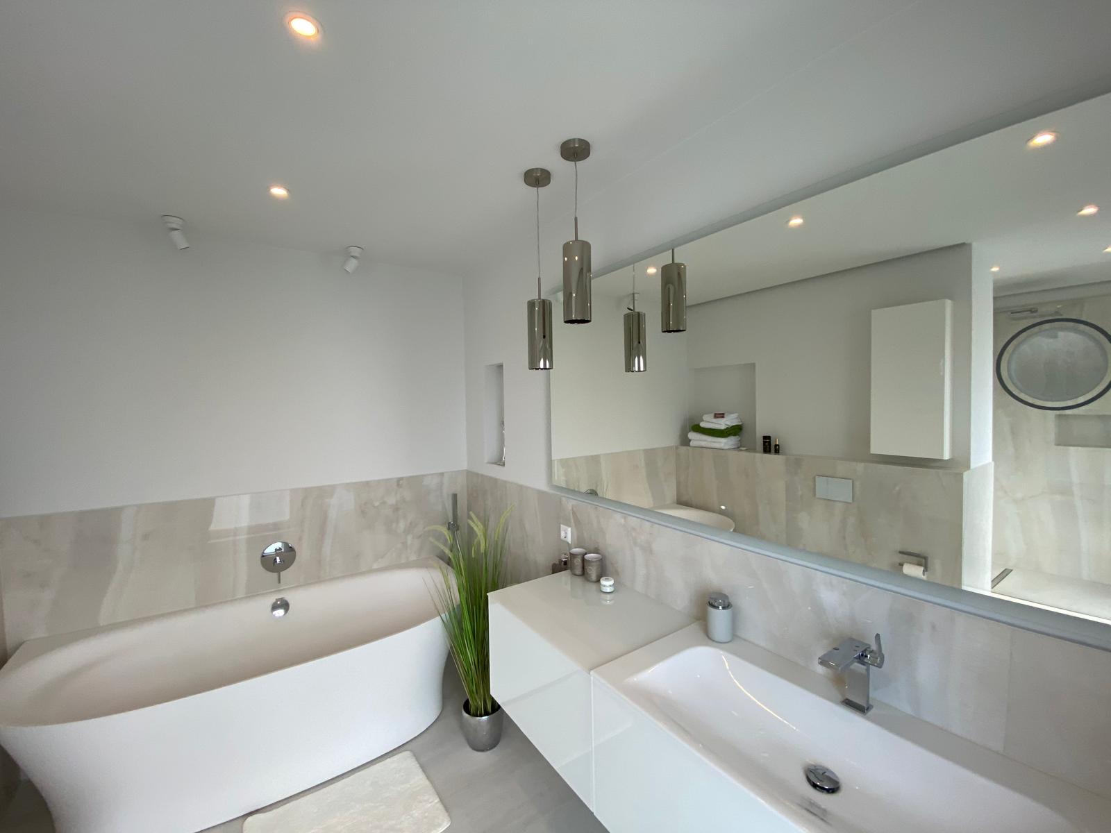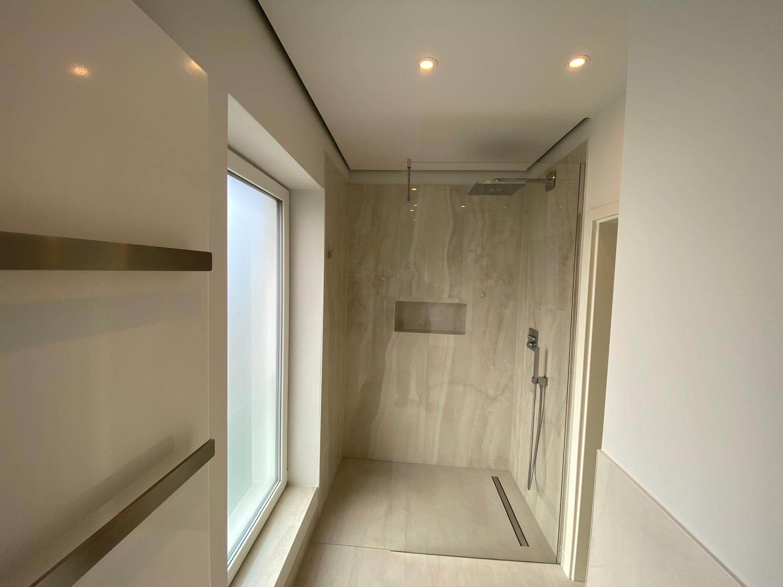 Komplettsanierung mit barrierefreier Dusche, keramischen Boden- und Wandfliesen, minimale Bauzeit und saubere Endreinigung.
